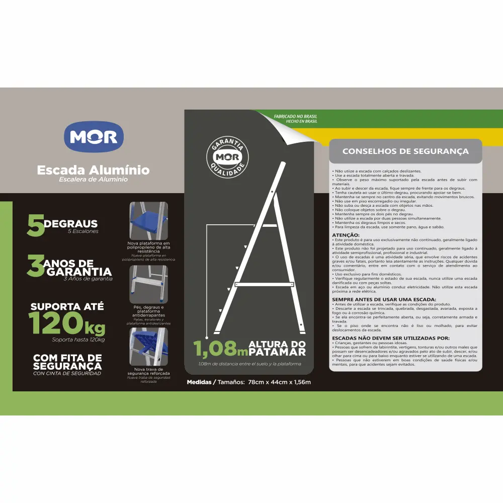 Para realizar consertos e manutenção doméstica com segurança é preciso ter uma escada que mantenha você firme no momento da utilização. Por isso a Mor elaborou a Escada de Alumínio 5 Degraus, ideal para pequenos reparos e para alcançar lugares mais elevados em sua casa. Dobrável e fácil de guardar possui estrutura em tubo retangular e chapas em alumínio, material super leve, durável (mesmo em áreas litorâneas!) e peças plásticas em polipropileno de alta resistência. Além disso, seus pés antiderrapantes e travamento automático na plataforma superior garantem maior estabilidade para suportar até 120 Kg.