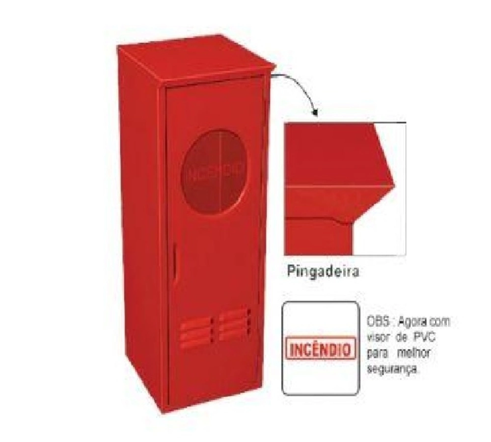 Abrigo para extintor de incêndio de sobrepor (externo a parede) em chapa de aço 22 (0.60 mm), pintado na cor vermelha. Possui uma porta com visor, suporta extintores de até 12 kilos, PO/ CO2, ÁGUA. Acompanha placa em PVC com inscrição INCÊNDIO.