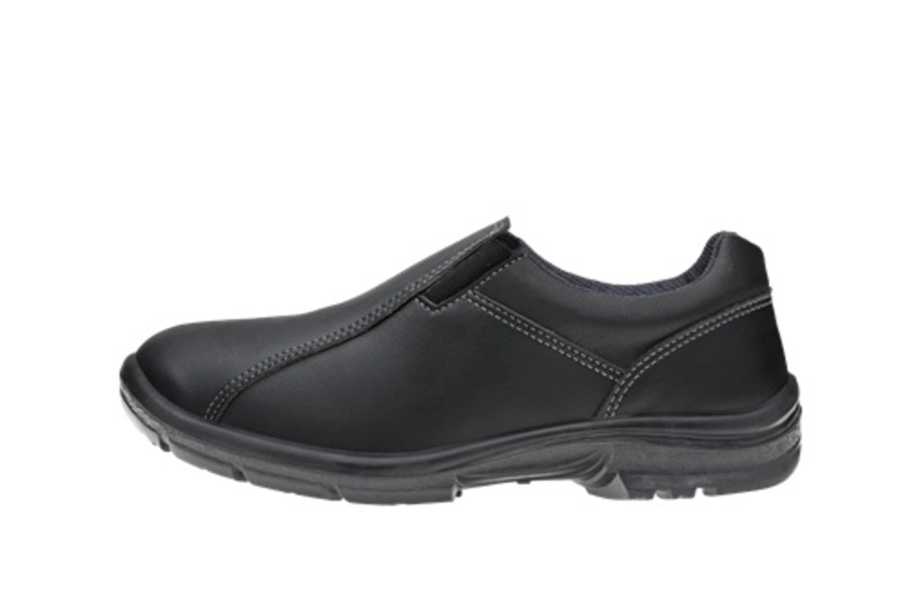 Solado ergonômico em PU bidensidade, com sistema de absorção de impacto, injetado diretamente no cabedal.