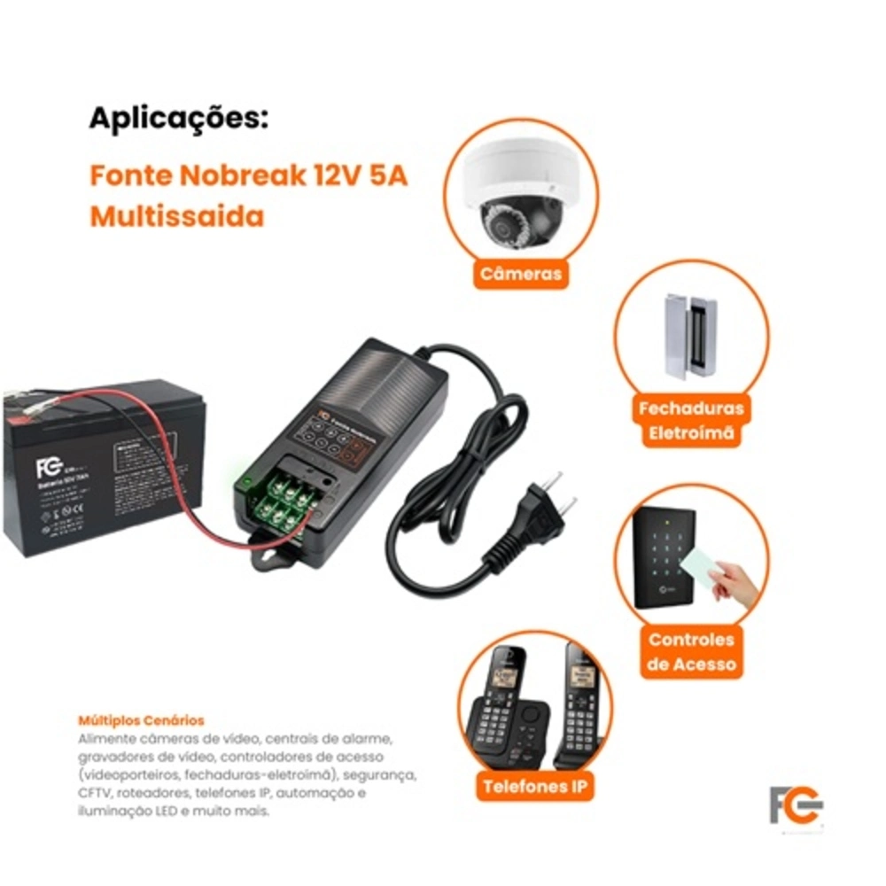 A Fonte Nobreak Multissaidas 12V 5A possui a Tecnologia DirectFast garantindo que na falta de energia elétrica os equipamentos alimentados não sejam desligados ou resetados. Seu sistema de alimentação Full Range fornece para os 3 canais de saída uma tensão totalmente estabilizada. Led indicador de modo rede e modo bateria conta ainda com Proteção total com desarme antecipado, surto de 2 níveis.