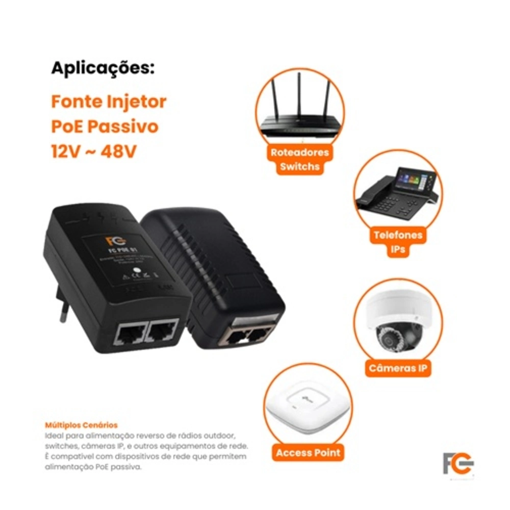 O injetor POE da Fonte CFTV é compatível com dispositivos de rede que permitem alimentação PoE passiva de 48 Vdc. Ele oferece até 24 W em sua porta PoE passiva. Possui 2 portas no padrão RJ-45, sendo uma delas utilizada para fornecer alimentação junto aos dados e a outra para fazer a comunicação de dados junto ao cliente. Melhor custo beneficio para seu projeto, tenha dados e energia em um único cabo de rede (Cat5 ou superior) e diminua o custo da instalação e além de ter o desempenho da rede.