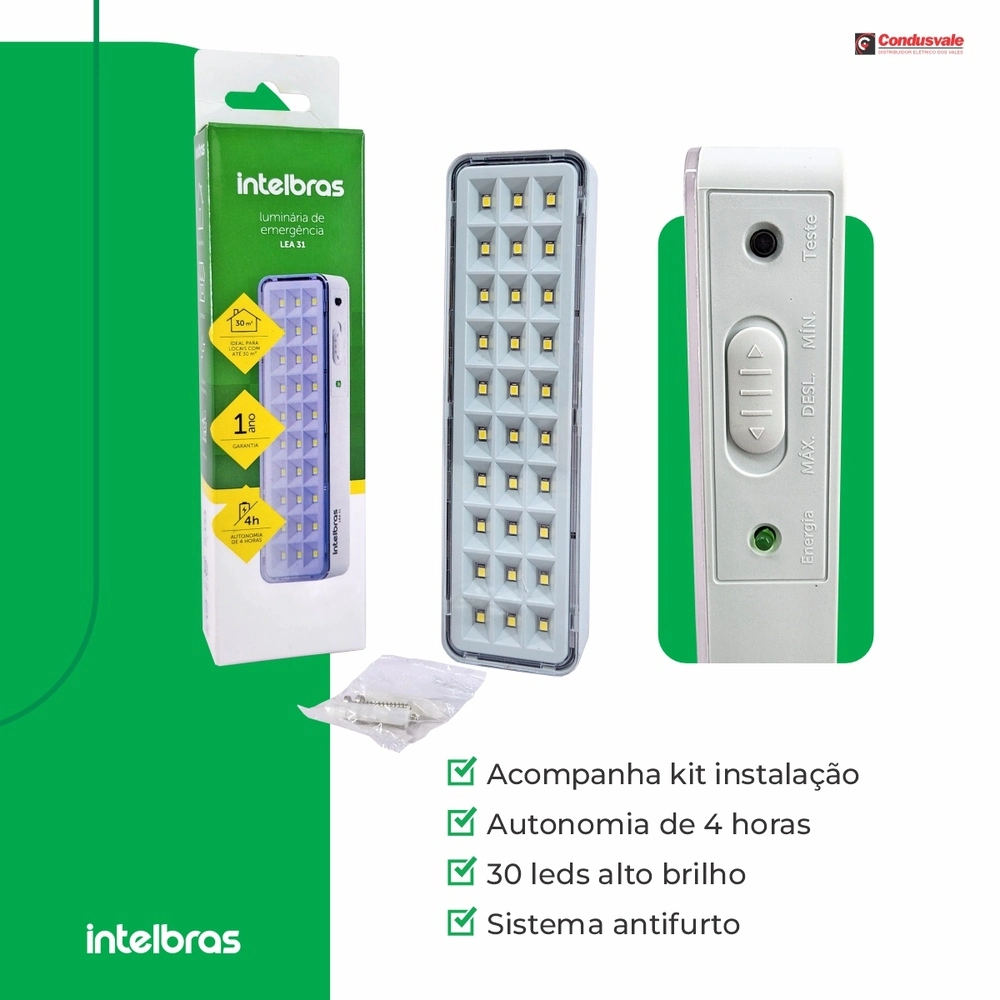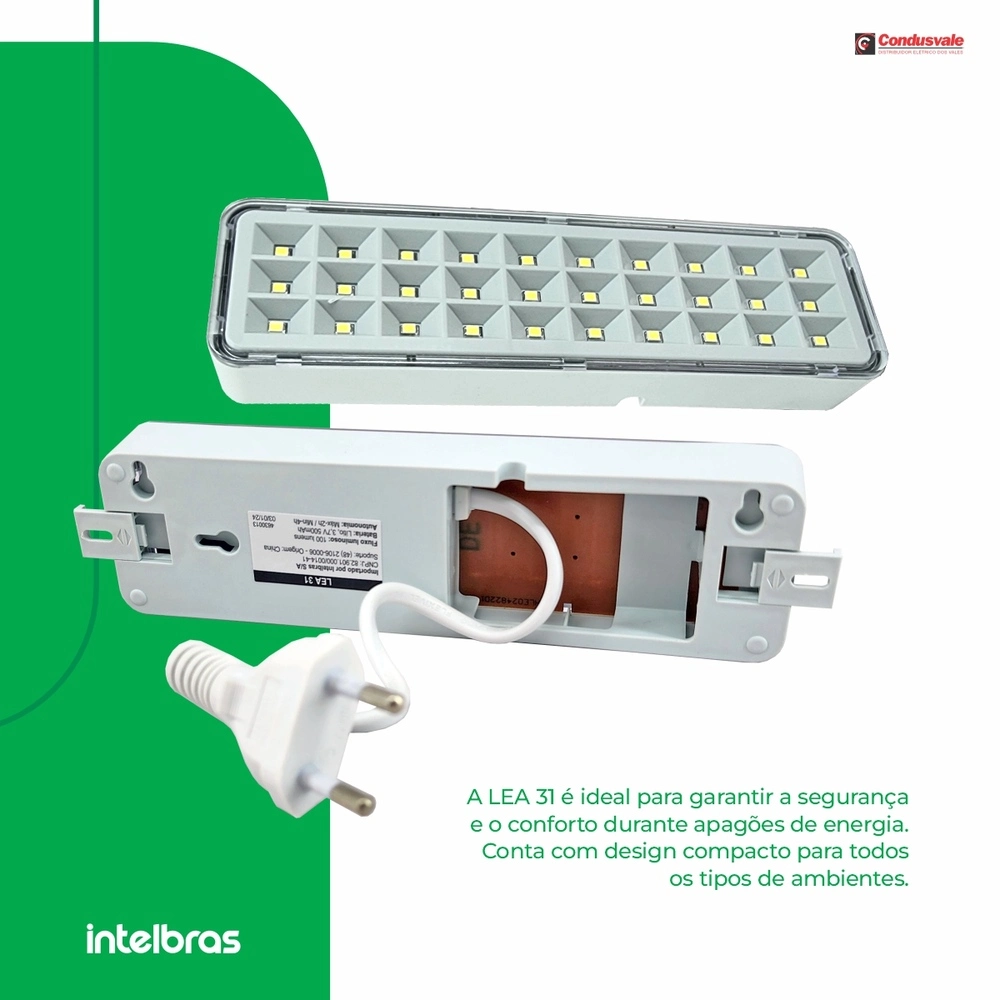 A luminária de emergência LEA 31 é fabricada com a tecnologia LED, que permite alto desempenho de iluminação associado a um baixo consumo de energia, baixa emissão de calor e alta durabilidade. Design moderno e discreto, fácil de instalar e operar, acende automaticamente na falta de energia elétrica, proporcionando segurança e conforto.