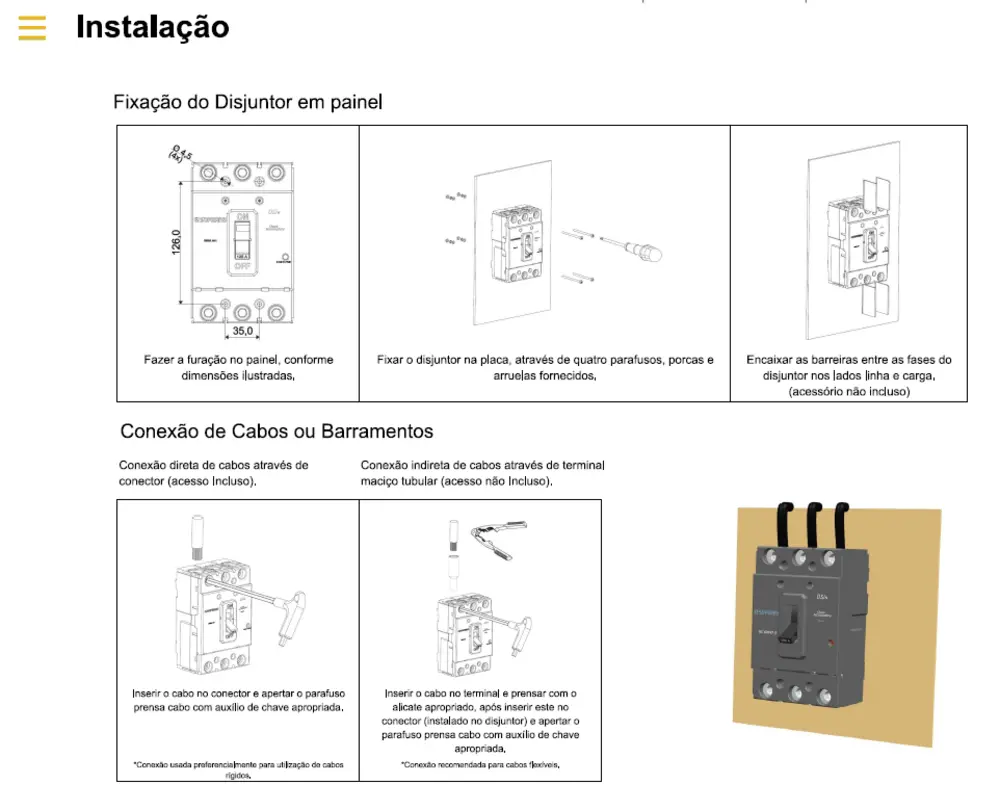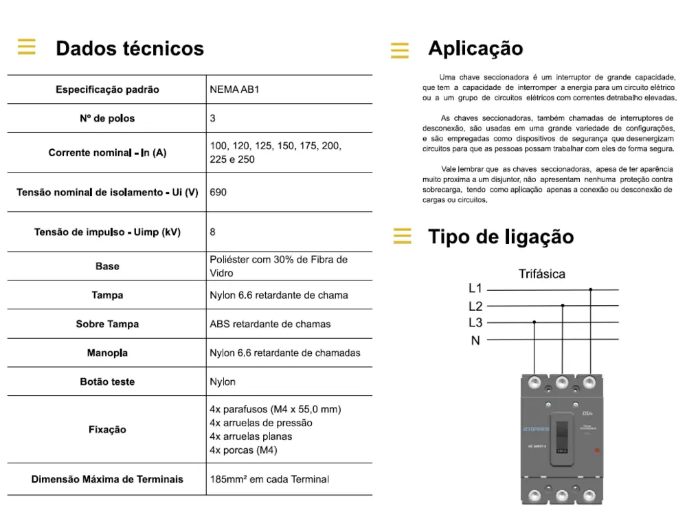 Tensão máxima de isolamento: 600 Vca;