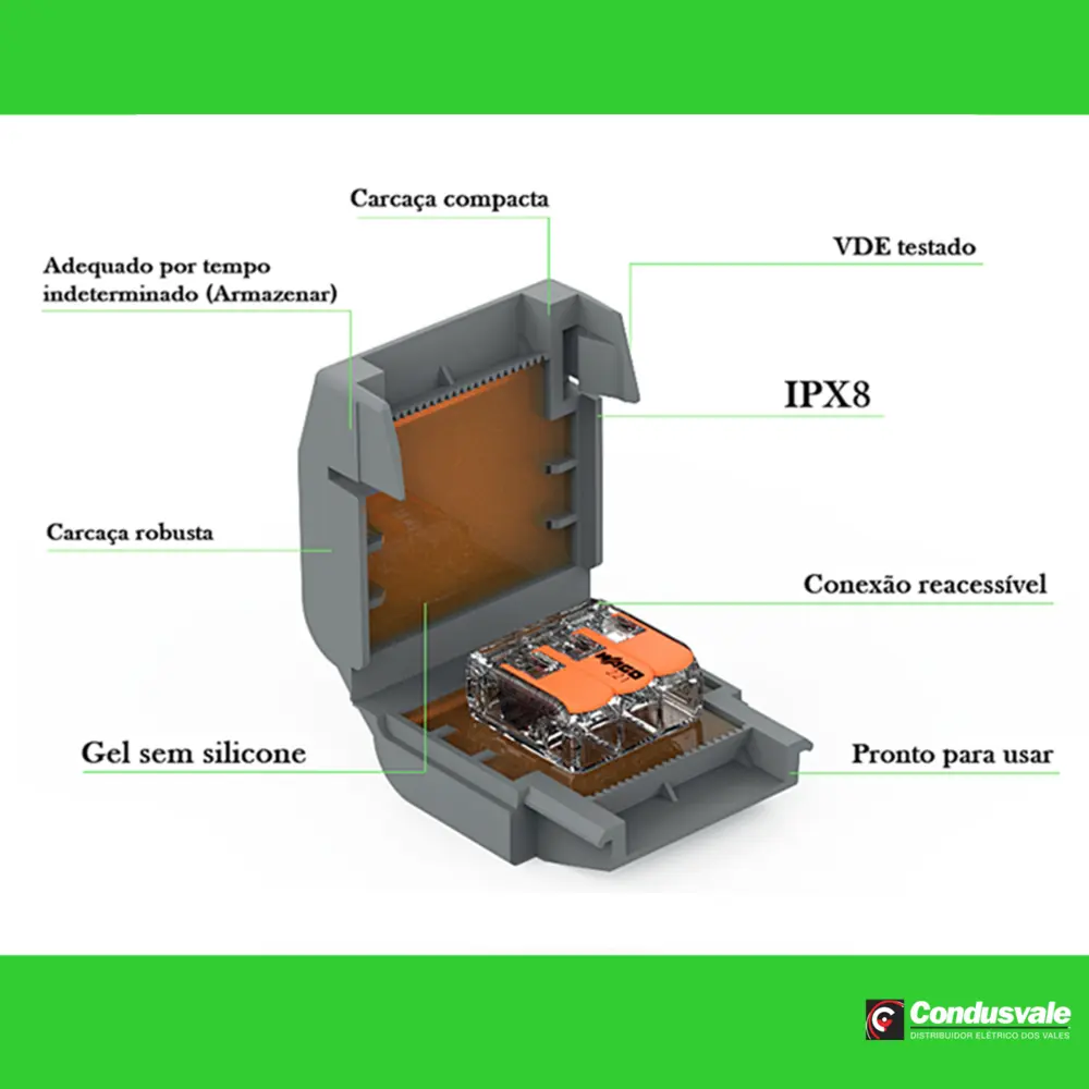 Proteção Superior: O gel interno proporciona uma excelente proteção contra umidade e poeira, garantindo a integridade das conexões.Com fator de proteção IPX8, permite conexões em áreas externas como jardins e caixas de passagem, podendo ficar totalmente submersa sem prejudicar a qualidade da emenda, trazendo segurança contra possíveis curtos ou choques elétricos.