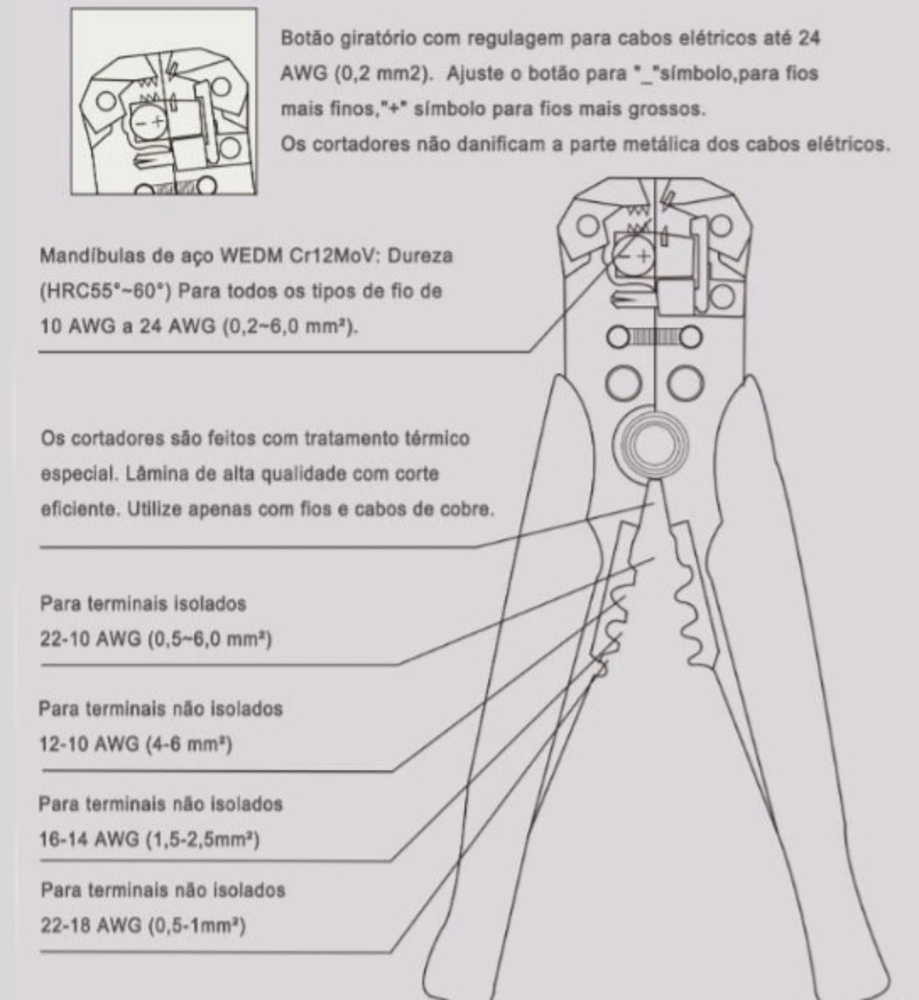 Botão giratório com regulagem para cabos até 24 AWG (0,2mm). Ajuste o botão "-", para fios mais finos, "+" para fios mais grossos.